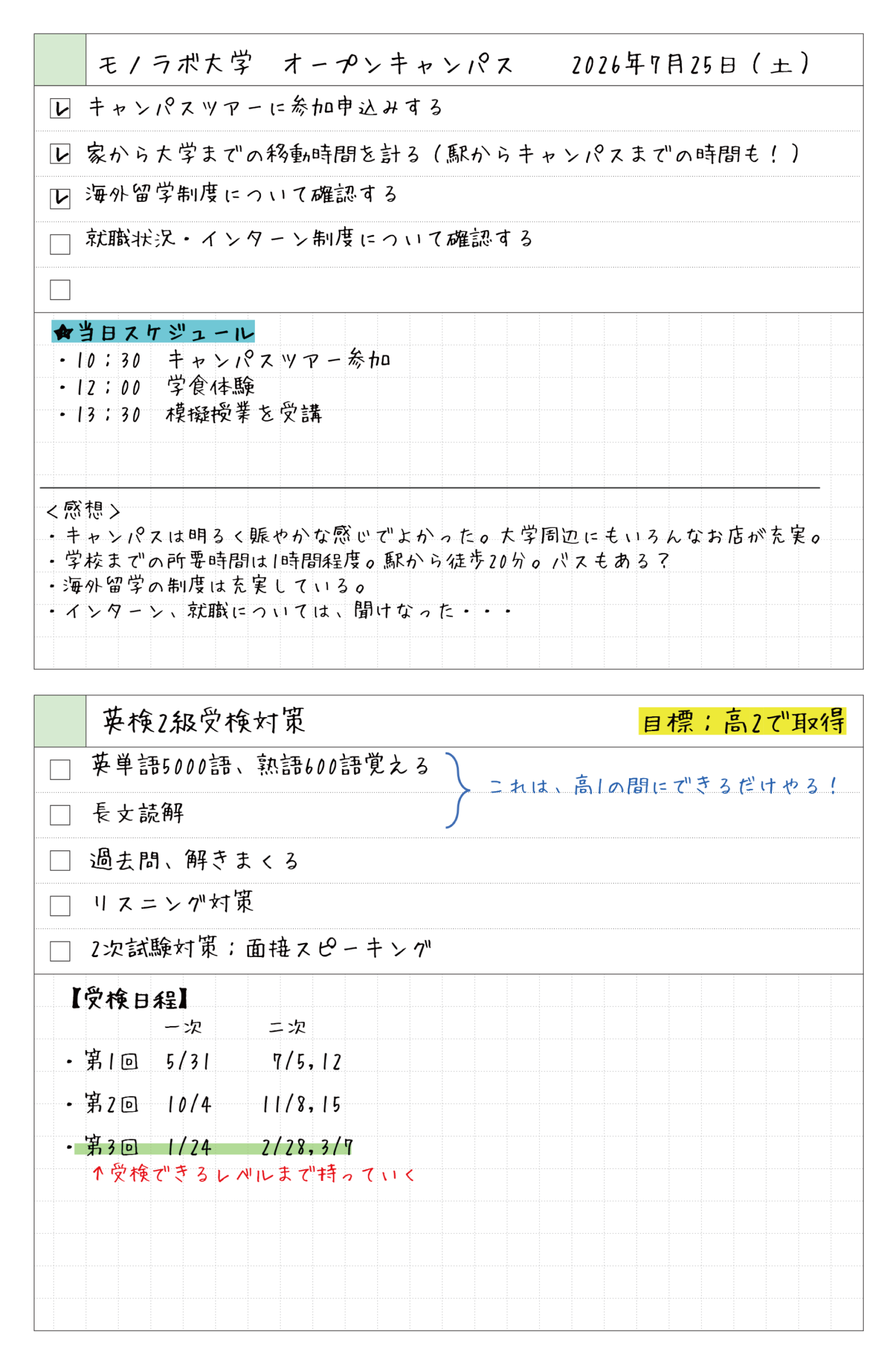 志望大学の情報・オープンキャンパスの記録をする、資格試験対策や教科別の学習についてまとめる、など使い方はいろいろです。