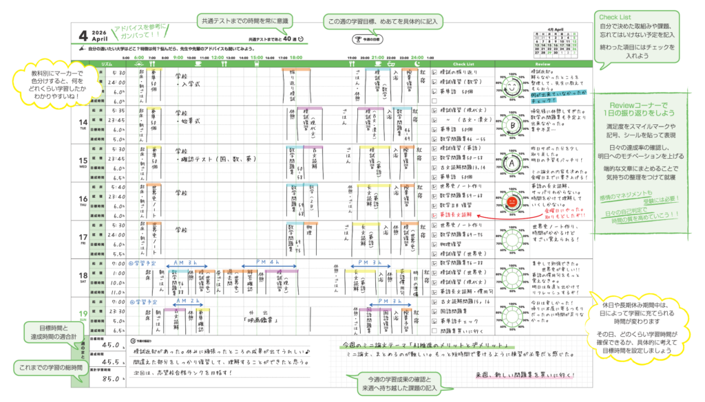 - 目標に向かって学習計画を立て、自分がどのように行動したのかを記録していきます。