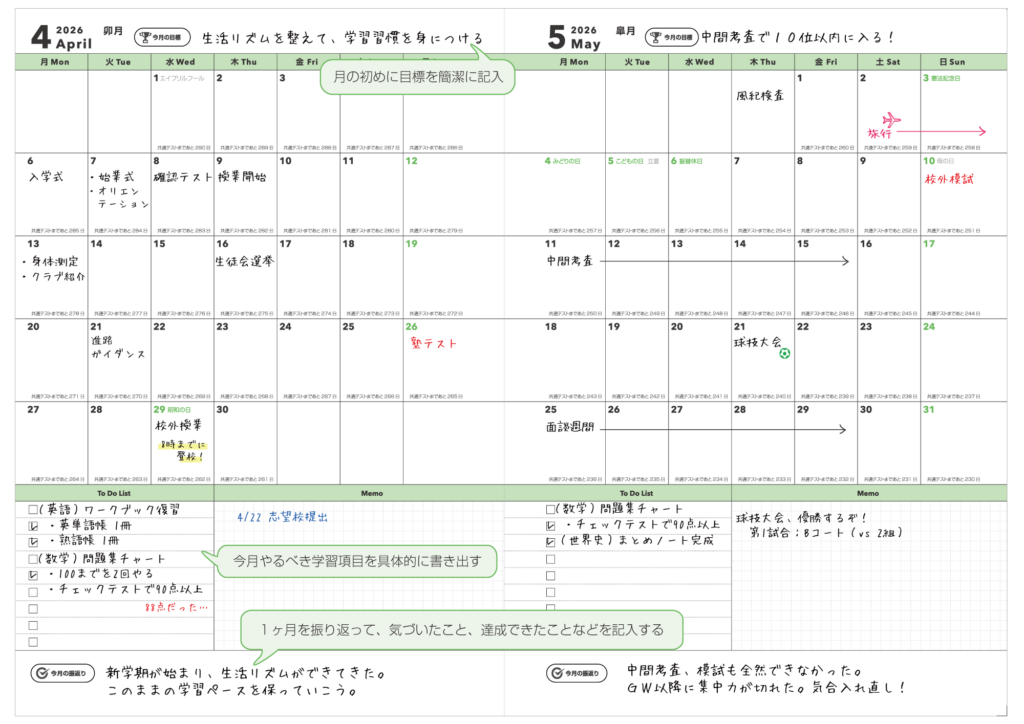 学校行事・塾やプライベートの予定を記入し、月間のスケジュールを把握する